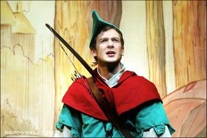 Robin Hood and his band of merry women and men had the crowd rocking to the music and rolling with laughter as they took the audience on an adventure through Sherwood Forest. The on-stage action may be set in Nottinghamshire, but local landmarks also come in for some slapstick. Girls who work for Vodafone should be avoided as they are ‘Pay as you go’, while a beautiful but empty place referred to is the nearby Watermill Theatre. Ian Mowat as the dame, Lady Shania Tuck, is on a manhunt, but not for an outlaw, just any man. The unlucky man on opening night turned out to be ‘Big Geoffrey’ in the stalls. Lady Shania performs more costume changes than there are scenes, and if you never imagined a lady of a certain size and age could do a cartwheel followed by the splits think again. Her washing-line striptease has to be seen to be believed.