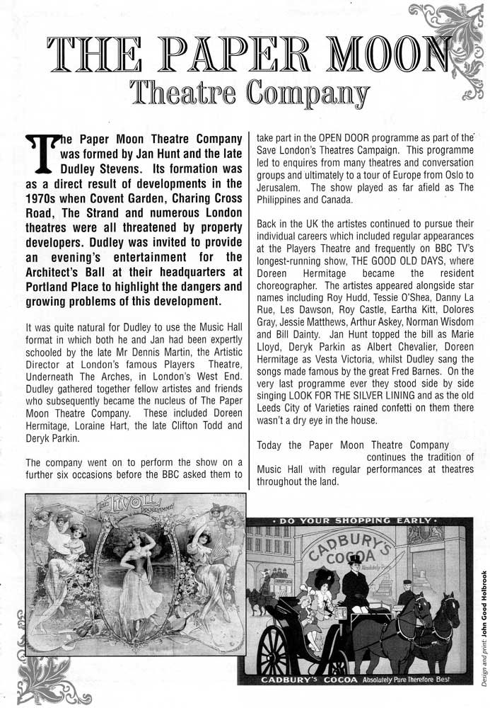 The PAPER MOON THEATRE COMPANY with their producer Jan Hunt (who featured in fifteen of the television productions) are proud to be ambassadors for this great show as they tour England with: